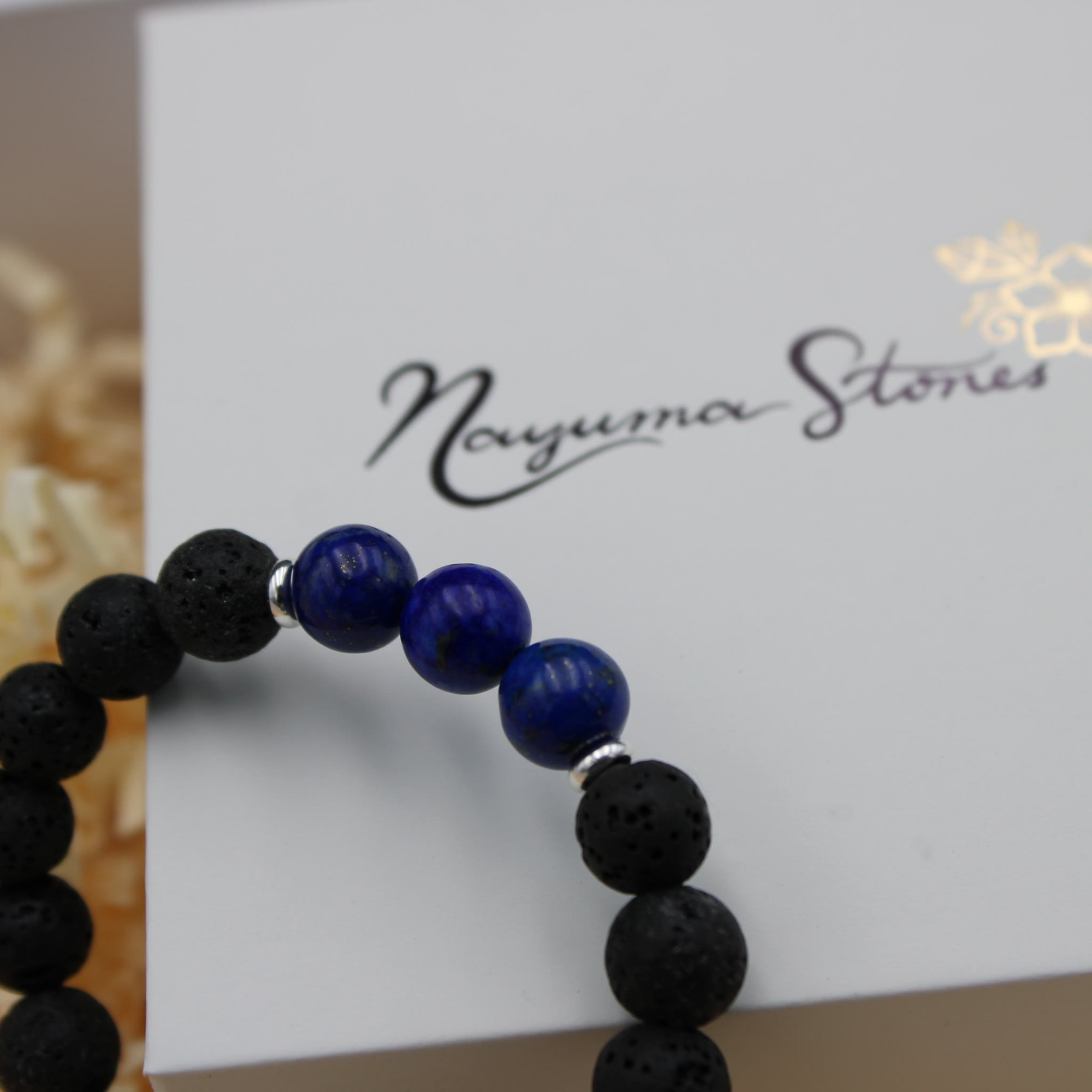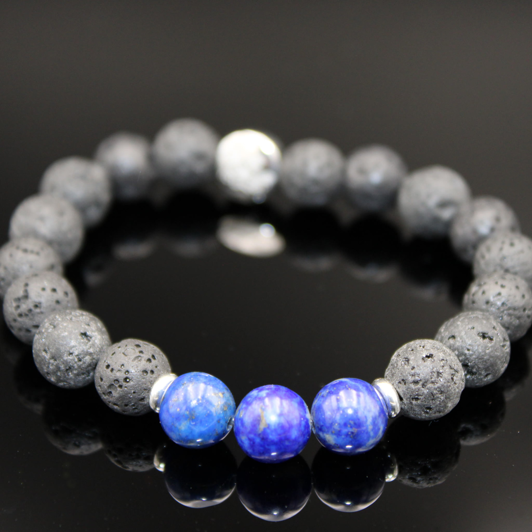 Material: Naturstein (Lapislazuli), Lavaperlen, Edelstahl