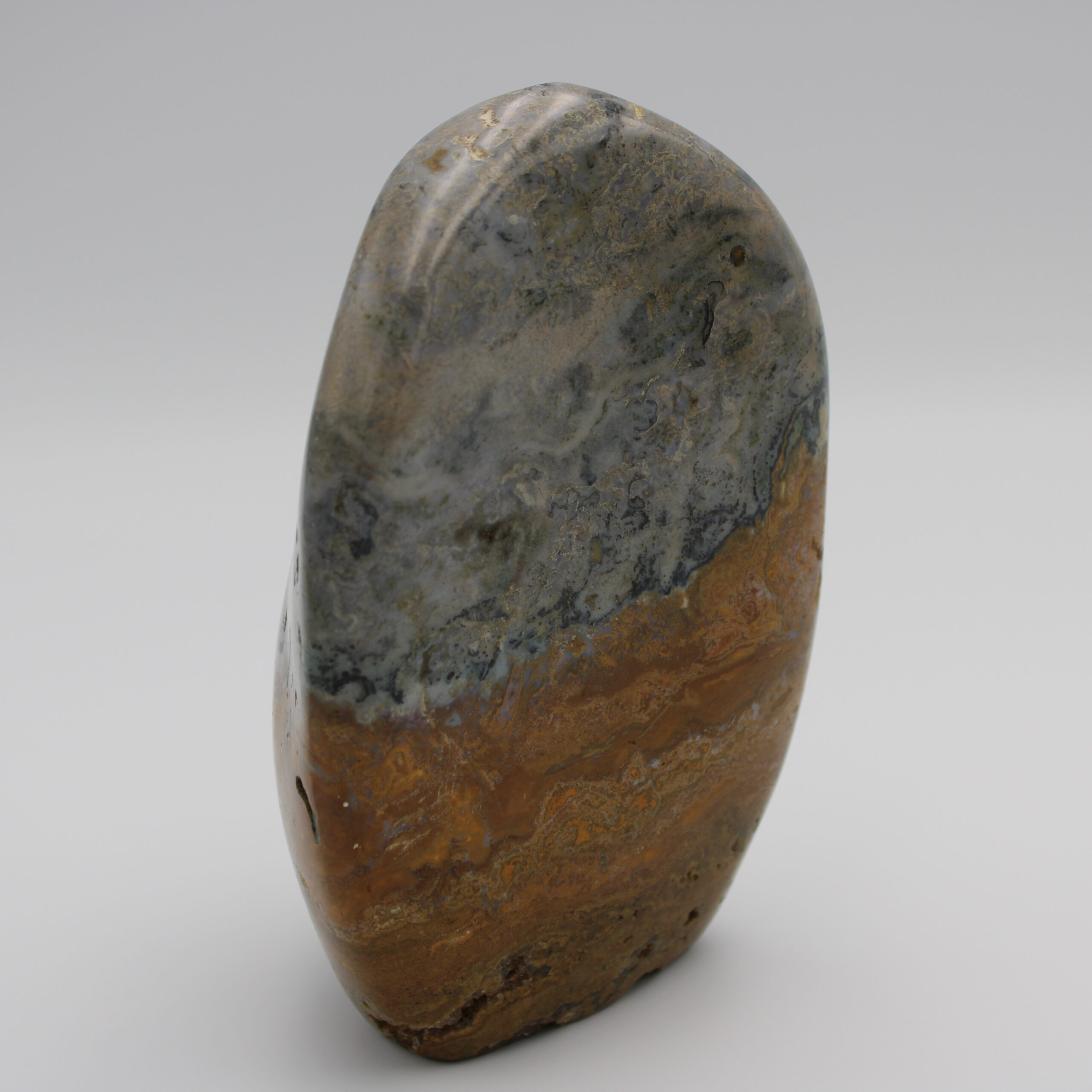 Diese prachtvolle Freiform aus Ocean Jaspis ist ein wahres Naturkunstwerk: Grüntöne wie Algen im Wasser, rostrote Adern wie die untergehende Sonne, zarte Blau- und Cremenuancen wie Meeresgischt – all das vereint sich in diesem Stein zu einer bewegten, fast maritimen Landschaft. Die polierte Oberfläche bringt die vielschichtige Struktur und das Zusammenspiel der Farben besonders schön zur Geltung.